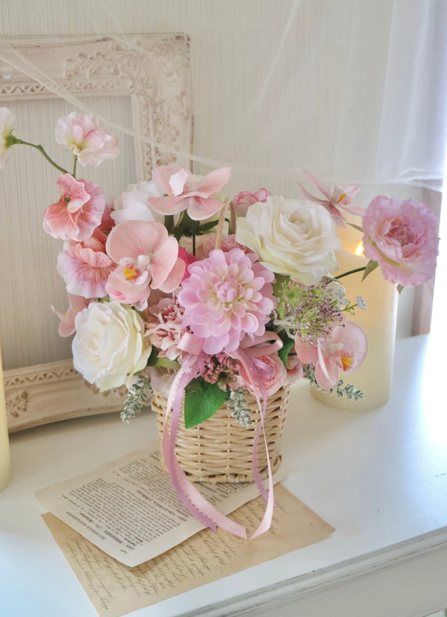 この花かごは、アーティフィシャルフラワー(上質な造花)で仕立てています。