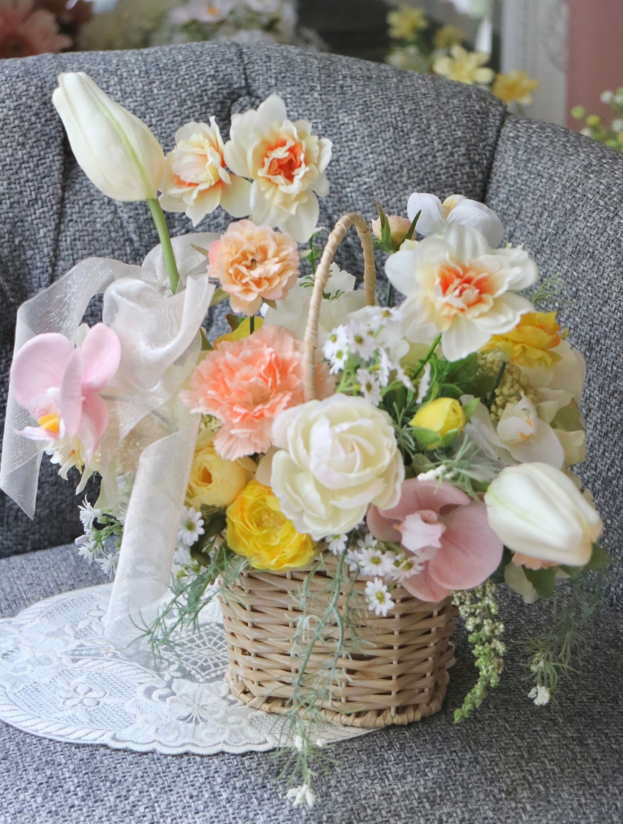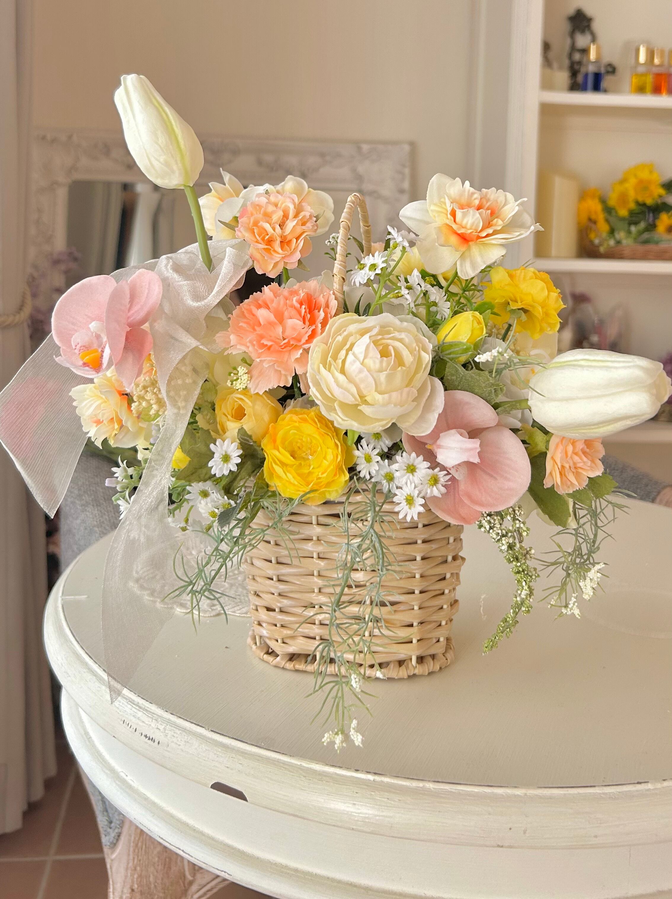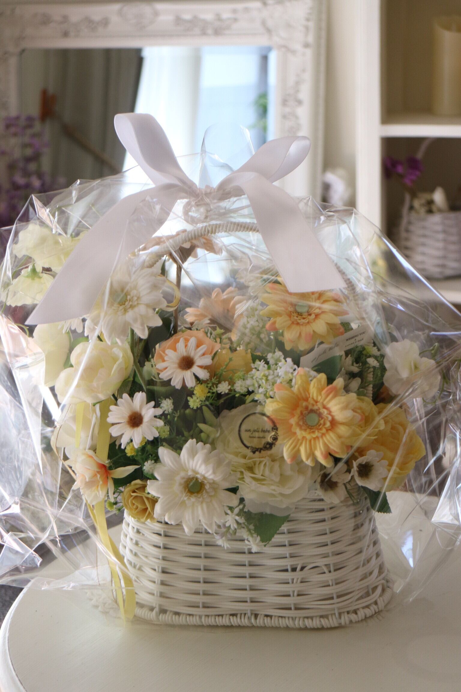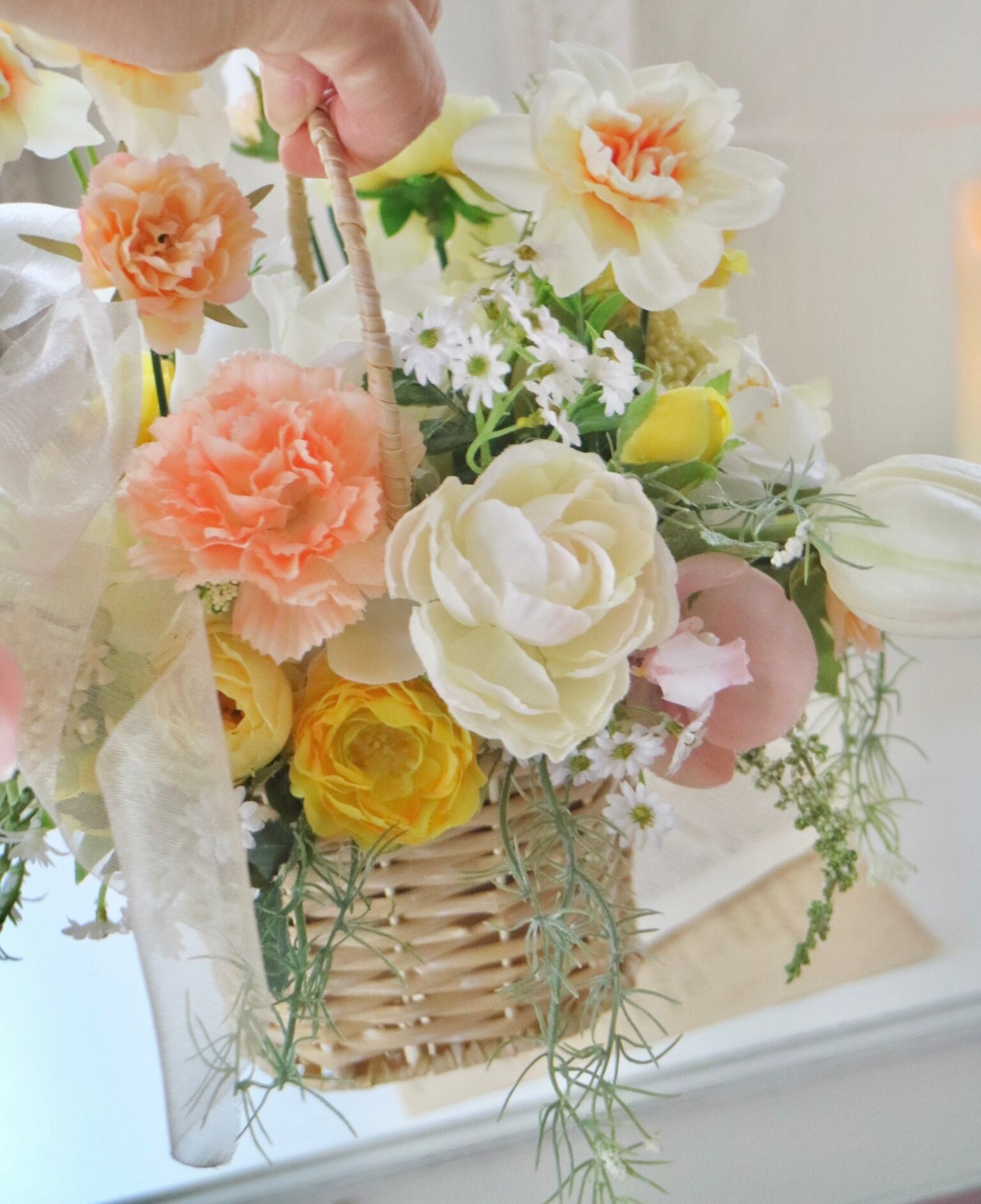 この花かごは、アーティフィシャルフラワー(上質な造花)で仕立てています。
