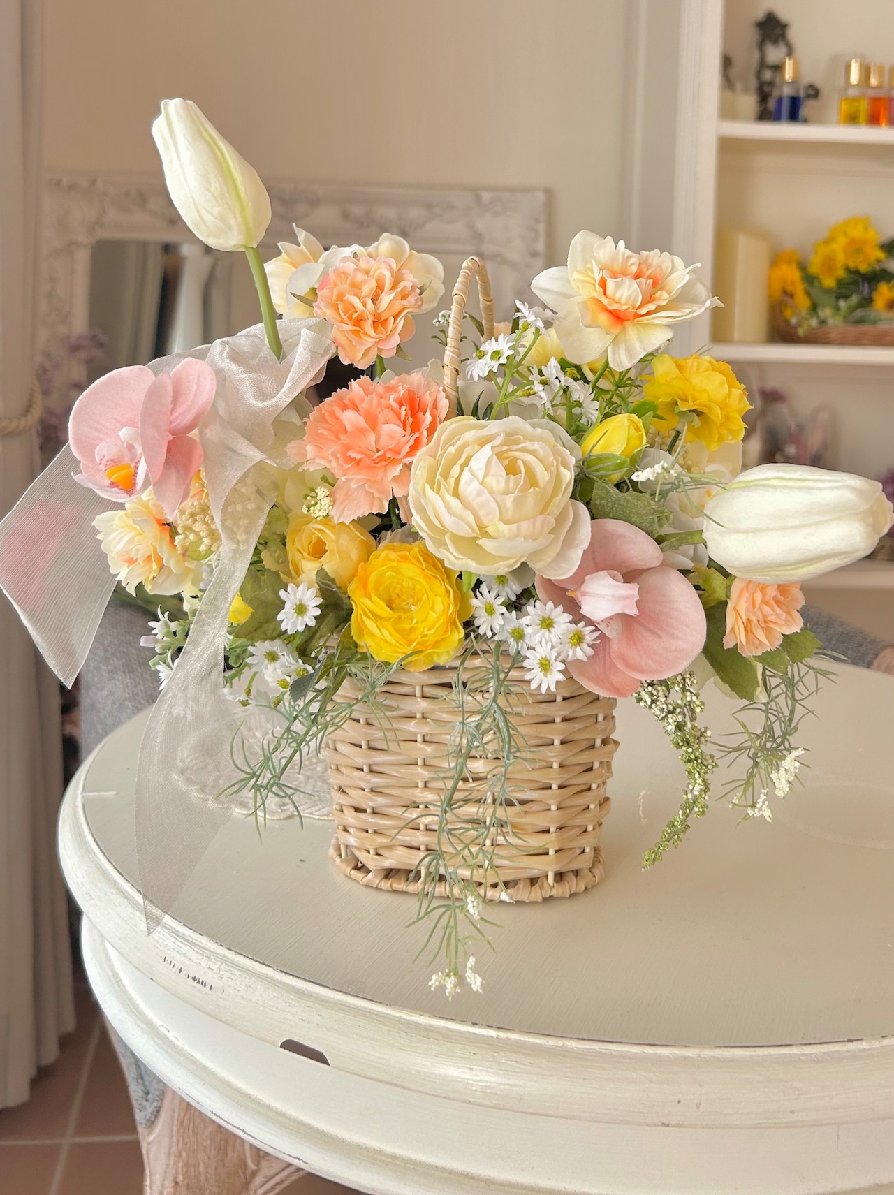 明るいイエローオレンジとやわらかなホワイトを重ねた花かごブーケ。